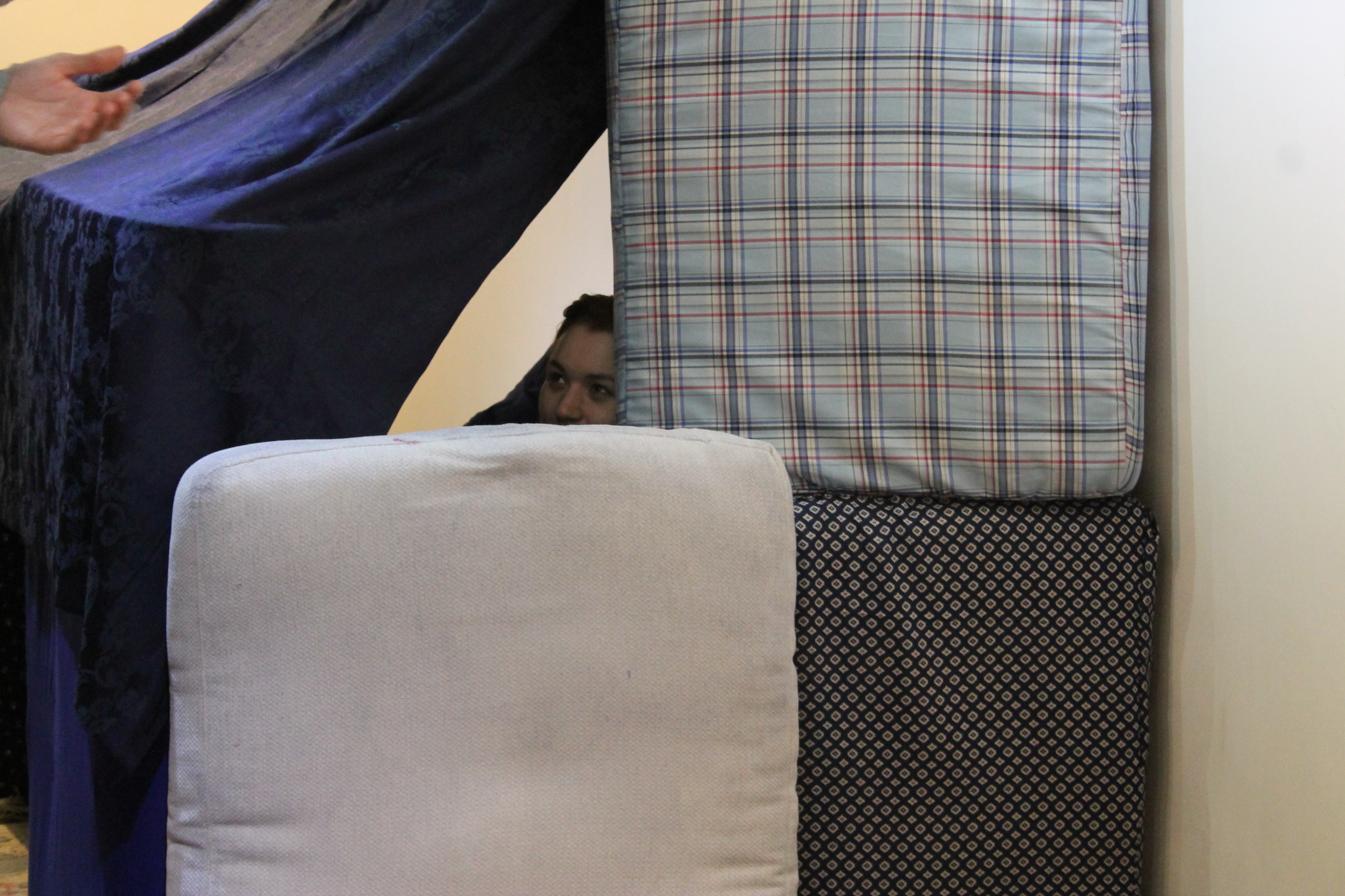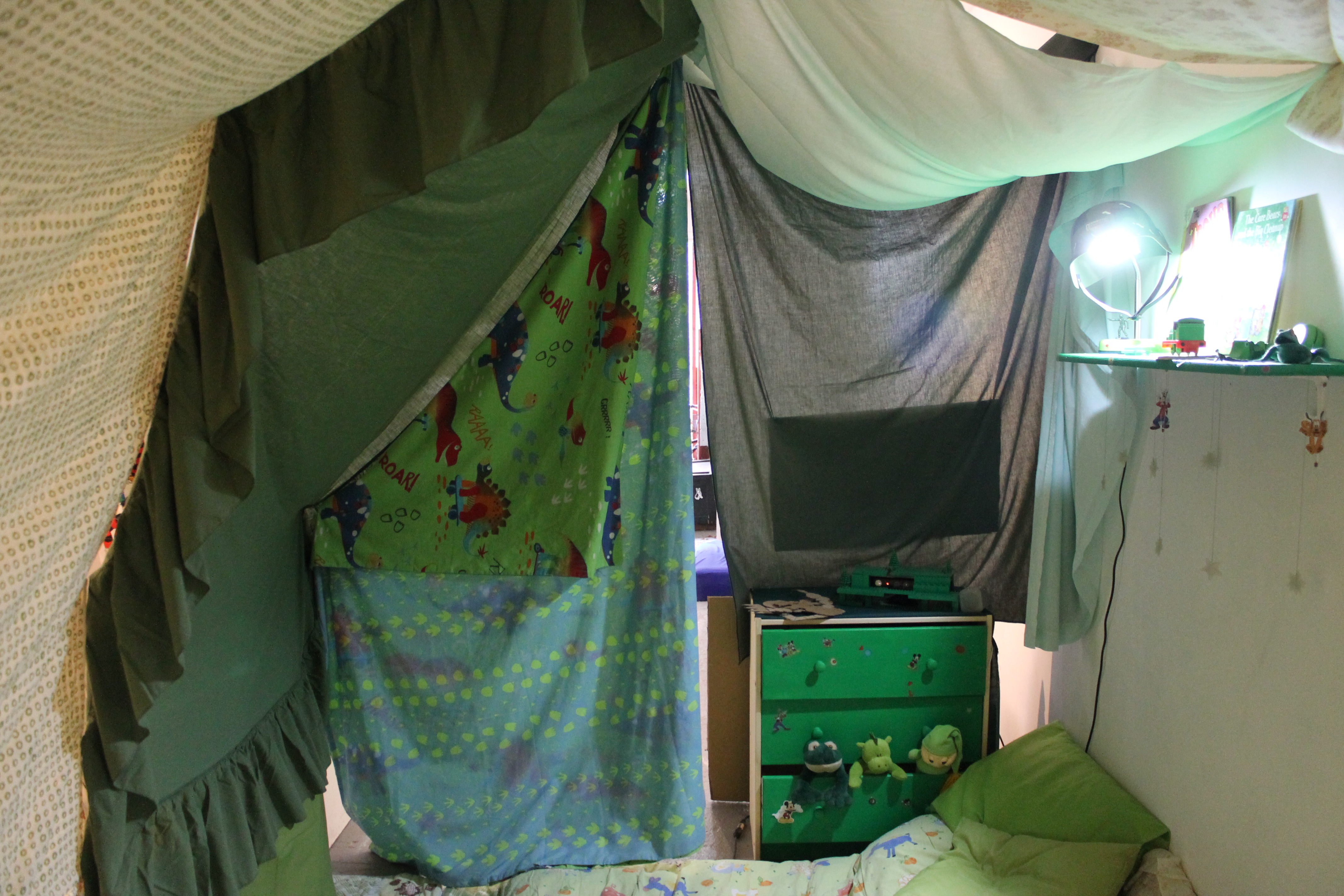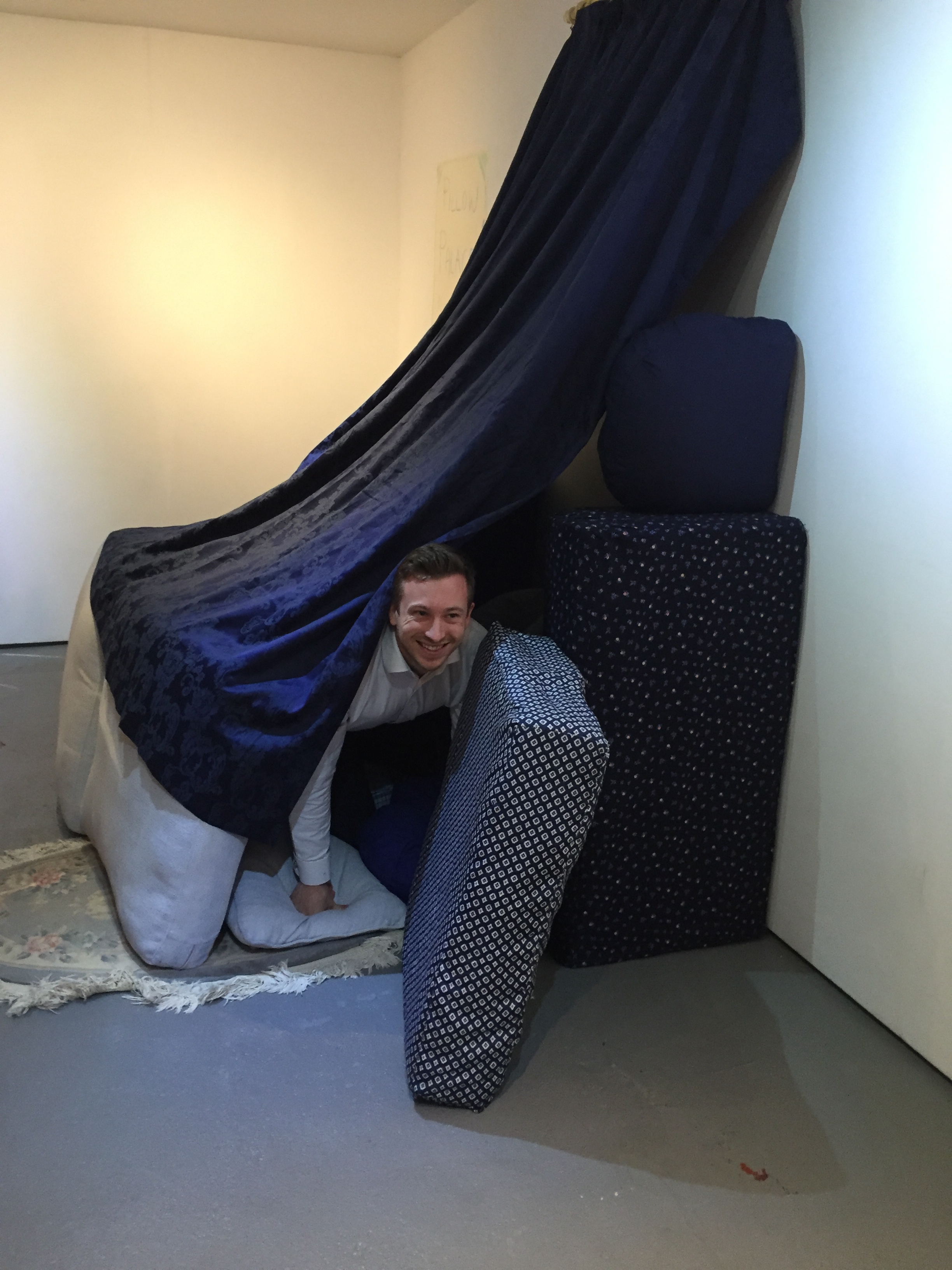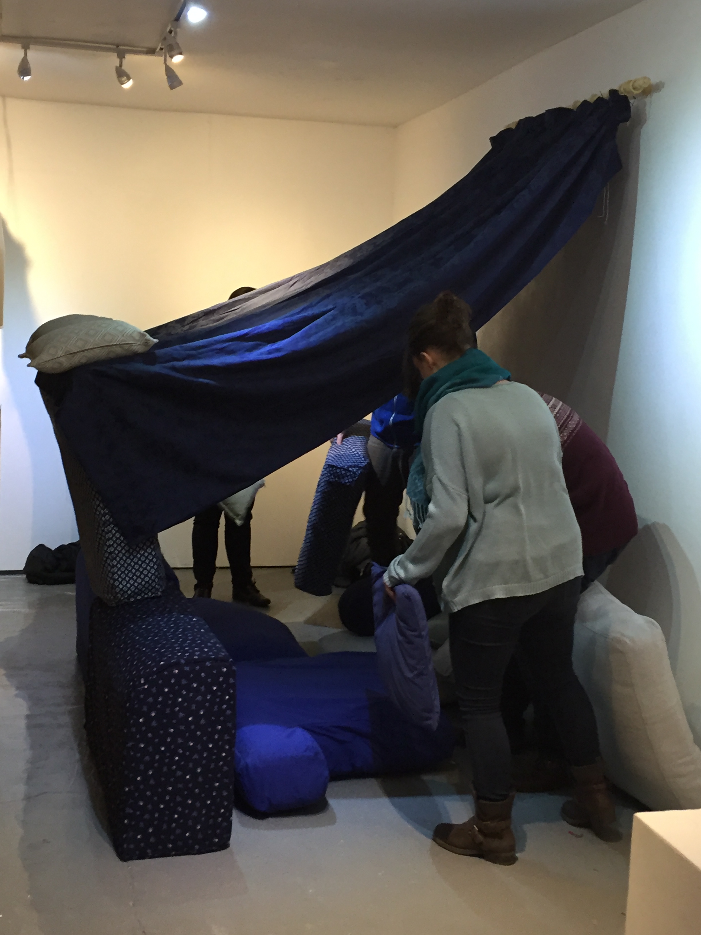 The gallery space was transformed into a large blanket fort with spaces to play, imagine and explore. Different sounds will be produced by interacting with different objects in the space. The more you explored the more sounds you unlocked.